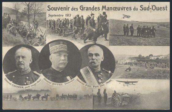 souvenir military postcard of the GRAND MANEUVERS OF THE SOUTH-WEST, SEPT 1913. Shows scenes of French military units in action (2 show early biplanes) along with inset portraits of GENERALS CHOMER, JOFFRE & PAU. F, minor age stains on reverse (Image)