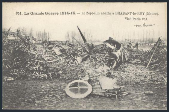 WWI postcard depicting the wreck of a GERMAN ZEPPELIN shot down at Braband-le-Roy. VF (Image)
