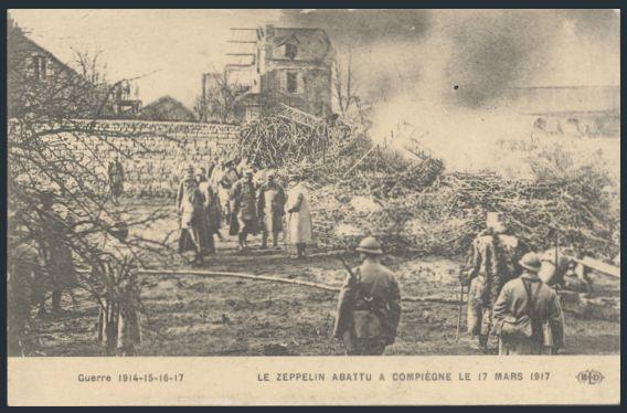 b/w postcard depicting the wreck of a GERMAN ZEPPELIN which was brought down by the French troops at Compiegne 17 March, 1917. VF (Image)