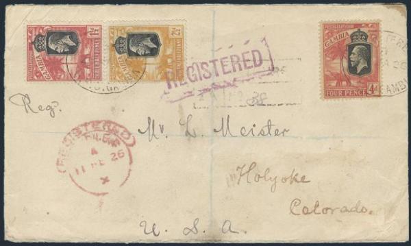2258 104, 106, 108 image104, 106, 108, Tied by GPO Gambia / Reg'd 20 Jan 1926 cancels on cover from Bathurst to Holyoke, Colorado. Has red London hooded & Chicago transits. F, some edge wear / slight soiling. Attractive KGV. Elephant franking (Image) Estimate 125.00+ $Cdn