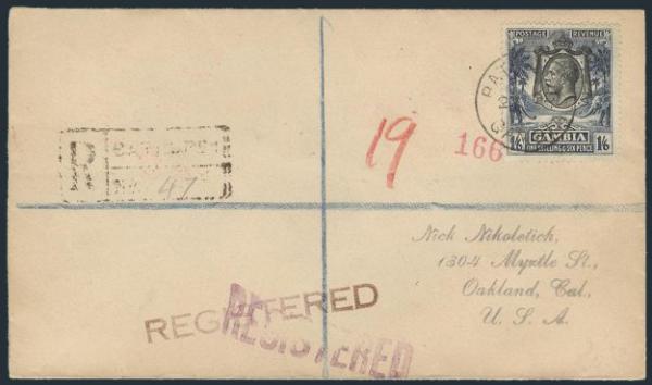 2251 71 image71 (9), Tied by GPO Gambia / Reg'd oval 18 Feb 1922 cancels on large size KGV 2d Reg'd postal stationery envelope from Bathurst to England. Has 1-line "LATE FEE PAID" h/s. F+. Eye-catching cover! (Image) Estimate 200.00+ $Cdn