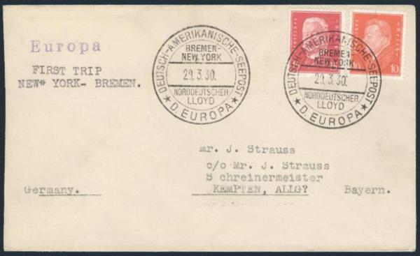 Tied by German-American Seapost / SS EUROPA cancels on cover for First Return Voyage New York to Bremen 29 Mar 1930. Addr to Rempten, Bavaria. Has violet "Europa" ship h/s. F-VF (Image)