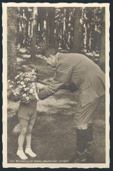 by Graz (Austria) 1942 slogan cancel on b/w photo postcard depicting ADOLF HITLER receiving a bouquet of flowers from a child. VF (Image)