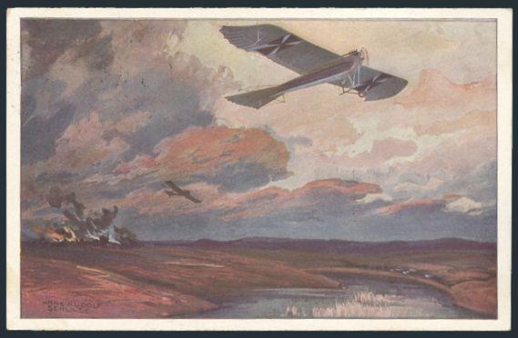 Bernburg 12 July 1915 CDS on WWI colour illustrated Patriotic postcard to Breslau. Depicts painting of German monoplane after a bombing nun. Artist signed by H.R. Schulze. VF