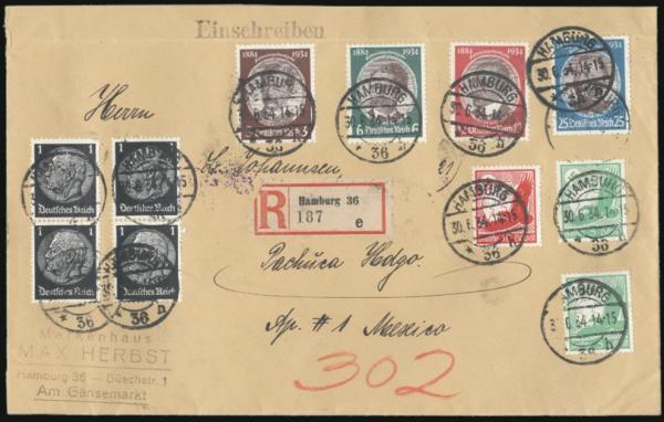 432-5, C46 (2), C47, Tied by Hamburg 30 June 1934 CDS's on Reg'd cover to PACHUCA MEXICO (rec b/s). F. A COLOURFUL COVER (Mi Cat 500 Euro as a FDC) (Image)