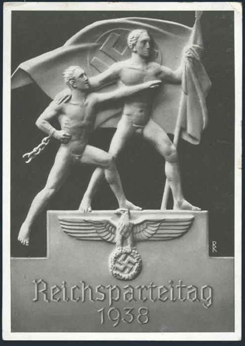 by Nuremberg slogan cancel on coloured 1938 Nazi Rally postcard. Depicts the official plaque of the Rally. Shows a flag-bearing German welcoming an Austrian freed from his chains & helping to raise the Nazi flag. VF (Image)