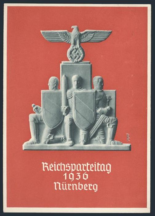 by Nuremberg slogan cancel on coloured 1936 Nazi Rally postcard depicting the official plaque of the rally. VF (Image)