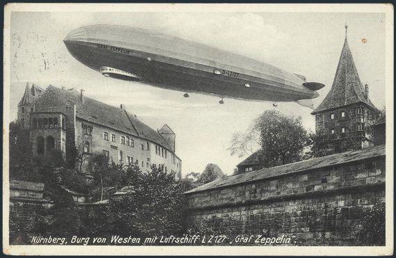 by Nuremberg 1933 NSDAP slogan cancel on b/w postcard depicting the LZ127 GRAF ZEPPELIN over Nuremberg. F, some minor toning (Image)