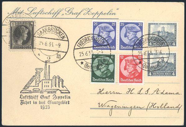 (Pair), B44 (2); Also Luxembourg #178, Tied on cach GRAF ZEPPELIN June 1933 Saar Flight Friedrichshafen to Saarbruchen postcard. Addr to Holland. VF. Attractive, interesting franking (Image)