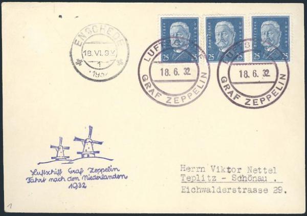 Tied by GRAF ZEPPELIN 18 June 1932 ON BOARD cancels on cach postcard for Netherlands Flight, addr to Teplitz-Schonau. VF (Image)