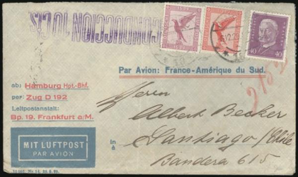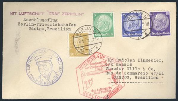 395-6, Tied on double cach GRAF ZEPPELIN First May 1933 South America Flight cover addr to Santos, Brazil. Has red Berlin connecting flight cachet. VF (Image)