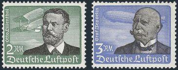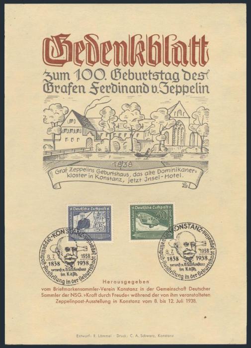 Airmail set tied by illustrated 8 July, 1938 postmarks on special panel commemorating the 100th Anniversary of the birth of COUNT FERDINAND VON ZEPPELIN. He was the famous Zeppelin airship inventor & builder. VF (Image)