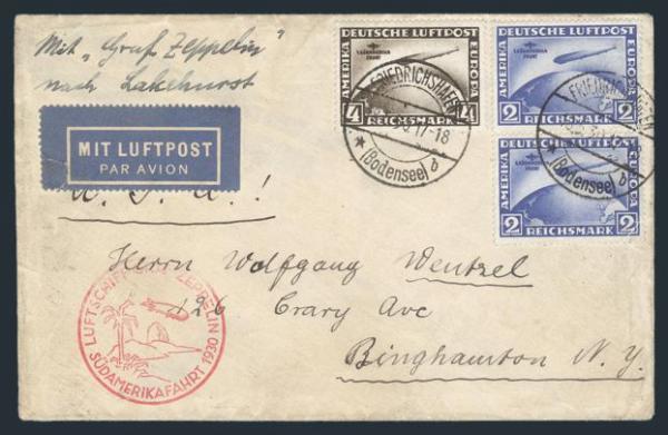 C39, Tied by Friedrichshafen 18 May, 1930 CDS's on cach SOUTH AMERICA FIRST FLIGHT COVER. Has green Lakehurst NJ "Round Flight" illustrated b/s. Addr to Binghampton NY. F
