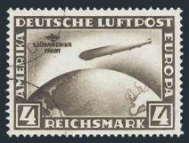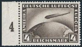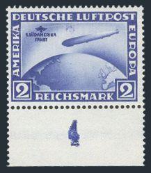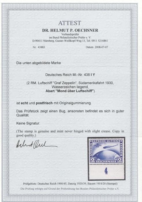 America 2 Mark Zeppelin sheet margin single. Has the scarce variety "MOON OVER AIRSHIP" (Mi #438IY, Cat 3,000 Euro). Fresh colour, VF, NH, slight crease. Has 1997 Oechsner Certificate (Image) (View Certificate)