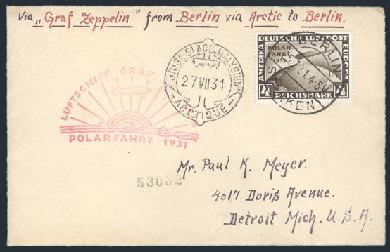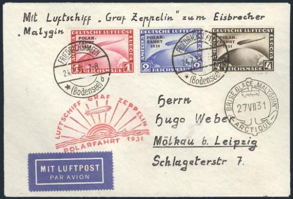 Polar 4 Mark Zeppelin stamp neatly tied on cach GRAF ZEPPELIN POLAR FLIGHT cover from Berlin with Icebreaker Malyguin rec cancel. VF. A nice cover with better franking
