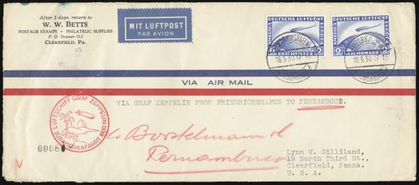 Zeppelin issues tied on cach GRAF ZEPPELIN First-Europe Pan-American 18 May 1930 flight / First South America flight cover with Pernambuco b/s. Addr to Clearfield Pa, with W.W. Betts, Stamp Dealer corner card. F (Image)