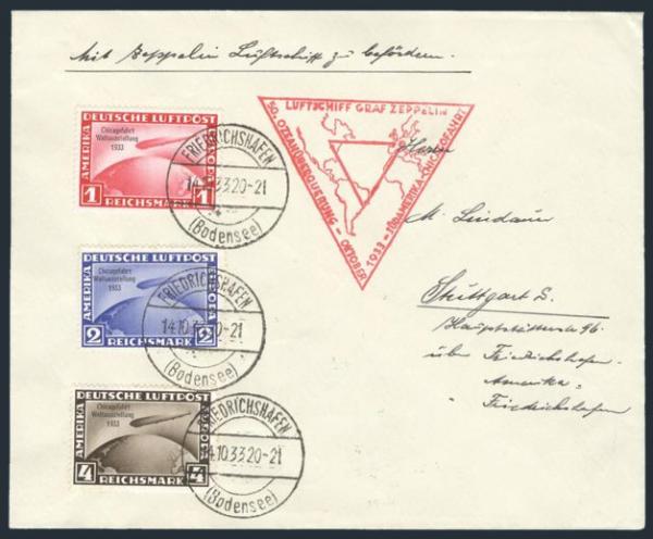 Complete set of Chicago Zeppelins neatly tied on cach GRAF ZEPPELIN Chicago Exposition Flight, Friedrichshafen to Akron, Nov 1933. VF. Scarce & attractive cover