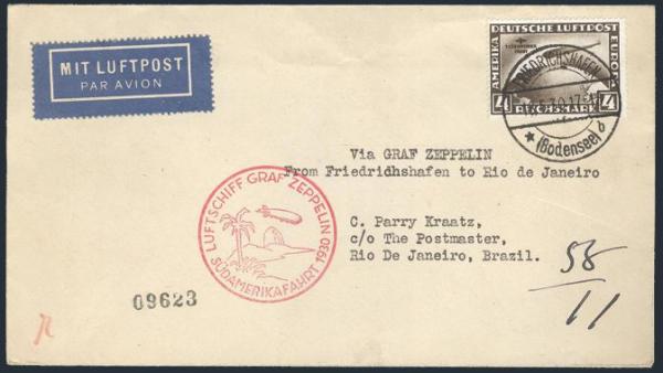 by Friedrichshafen 18 May 1930 CDS on Graf Zeppelin Flight cover to Rio de Janeiro Brazil (rec b/s). Has red Zeppelin h/s. VF, has guarantee b/s's (Image)