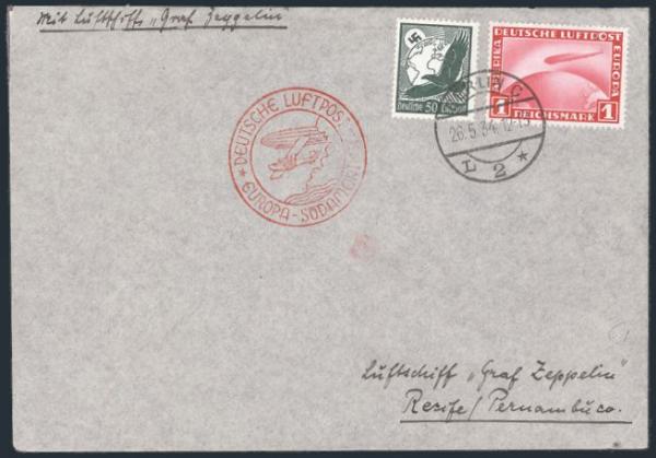 Tied on cach GRAF ZEPPELIN 1934 First South America Flight cover addr to Recife, Brazil. VF, slightly reduced (Image)