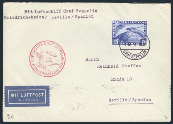 on cach GRAF ZEPPELIN May 1930 1st South America Flight cover, Friedrichshafen to Seville leg, with ON BOARD cancel. F-VF (Image)