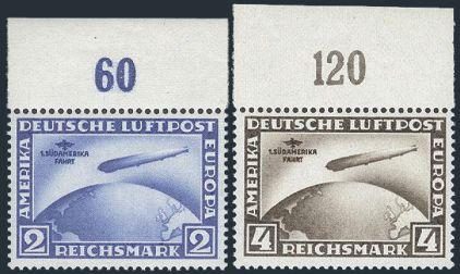 South America Flight Zeppelin set, top margin counter singles, fresh rich colours, VF, NH. Each with guarantee b/s in selvedge (Image)