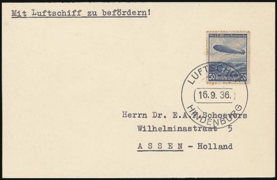 by Luftschiff Hindenburg 16 Sept 1936 on board cancel to VF HOLLAND FLIGHT ZEPPELIN postcard with Assen rec b/s 17 Sept '36 (Frost #1.129-24A, Cat $220) (Image)
