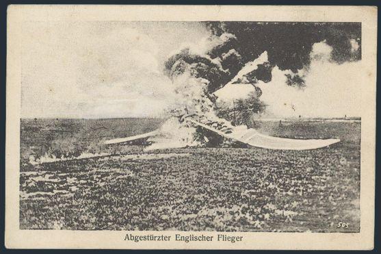 WWI postcard depicting a burning wreck of a downed ENGLISH AIRPLANE. F (Image)