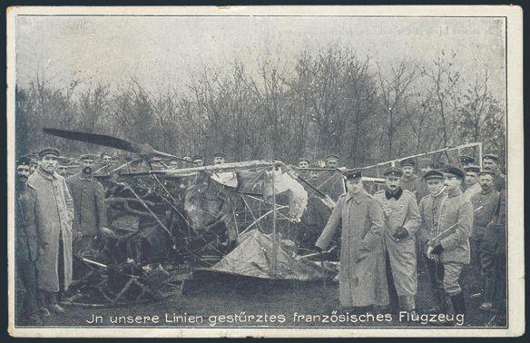 WWI photo postcard depicting a WRECKED FRENCH AIRPLANE surrounded by German Military Officers & Soldiers. F, minor stains (Image)