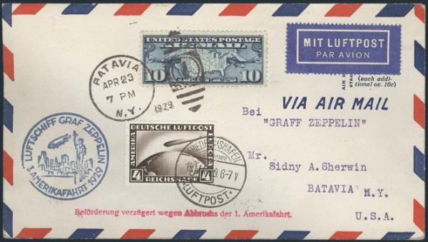 by Friedrichshafen 15 May, 1929 CDS on cach Graf Zeppelin First America Zeppelin Flight cover to USA. Also has USA #C7 tied by Batavia NY 23 Ap, 1929 duplex cancel. Has red delayed flight h/s. VF (Image)