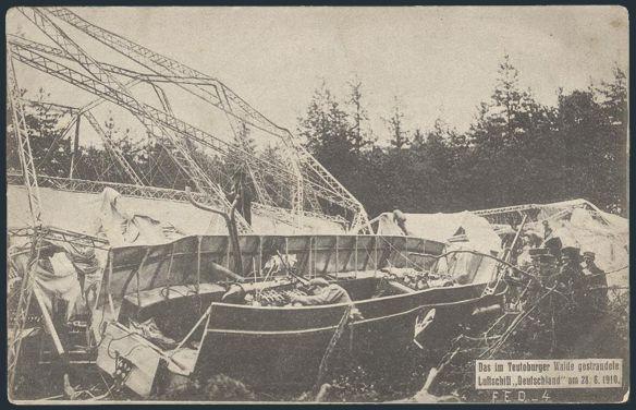 postcard depicting the 1910 WRECK OF DELAG'S FIRST ZEPPELIN AIRSHIP "LZ7 DEUTSCHLAND". The Zeppelin crashed in the Teutobourg Forest after flying into a thunderstorm. F