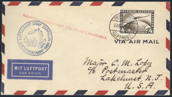 on cach GRAF ZEPPELIN May 1929 America Flight cover addr to Lakehurst. Has delayed flight h/s. VF (Image)