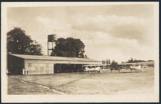 b/w real photo postcard depicting a GERMAN WARTIME AIRFIELD. Shows 2 Fighter planes, hangar, water tower, etc. F (Image)