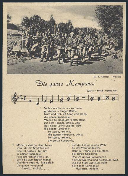 WWII b/w postcards depicting wartime songs of the military. Each postcard is illustrated with soldiers. Has verses for the songs "Die GANZE Kompanie", "Es ist so schon Soldat zu sein" and "Leb woh Rosmarie". One is used 1944 with special h/s for 10th