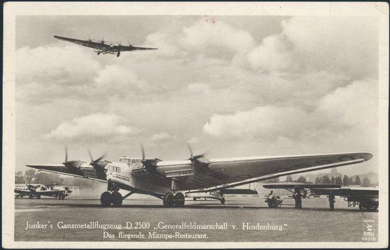 b/w photo postcards depicting Junkers "G38, D-2000" & Junkers "D2500" (Hindenburg) 4-engine passenger / cargo planes in the air & about to depart, circa 1930. One has red Lufthansa / Junkers G38 / D2500 / Hindenburg circular b/s. VF (Image)