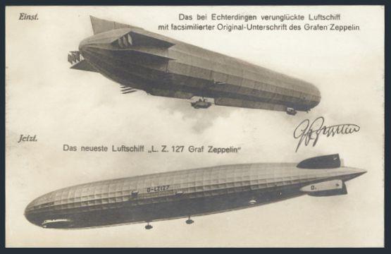 photo postcard circa 1931 depicting an early Zeppelin airship and the LZ127 Graf Zeppelin. VF (Image)