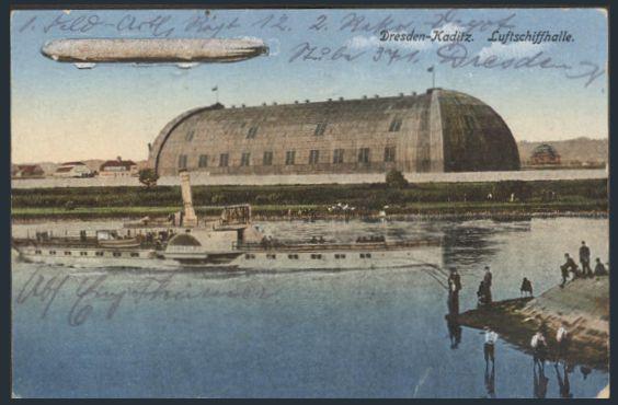 colour photo postcard used as WWI Feldpost from Dresden 25 Jan 1917 to Gunnersdorf. Depicts vintage Zeppelin in flight over hanger at Dresden with Paddle-wheeler in foreground. F (Image)