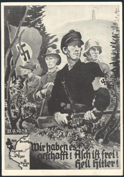 surcharged "50h" (occupation of Asch Sudetenland issue - Mi #1), Tied by Asch 30 Sept 1938 CDS & red Nazi illustrated cach on b/w illustrated Propaganda postcard depicting German soldiers from 4 diff units & regional map. VF, unaddr (Image)