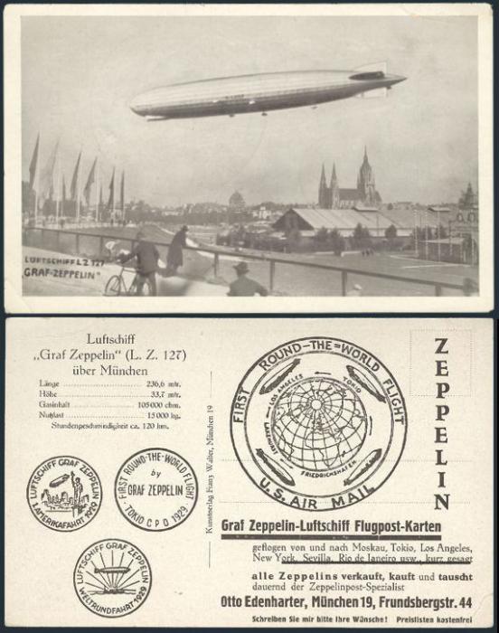 photo postcard circa 1929 depicting the LZ127 GRAF ZEPPELIN in flight over Munich. On reverse has ad for the Round-the-World Zeppelin flight illustrating 4 diff postmarks, details, etc. F, small corner crease. Scarce (Image)