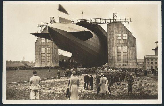 real photo postcard circa 1929 depicting the GRAF ZEPPELIN in its hangar surrounded by military soldiers & people. Has special oval Zeppelin h/s on reverse. VF