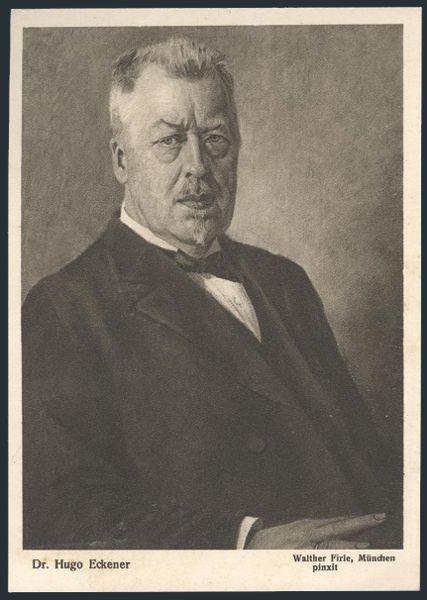 illustrated postcard circa 1930's depicting DR. HUGO ECKENER. He was the commander of the famous Graf Zeppelin for many of its record setting flights incl the first airship flight around the world. On reverse has ad for Youth Clubs. VF, unaddr (Image)