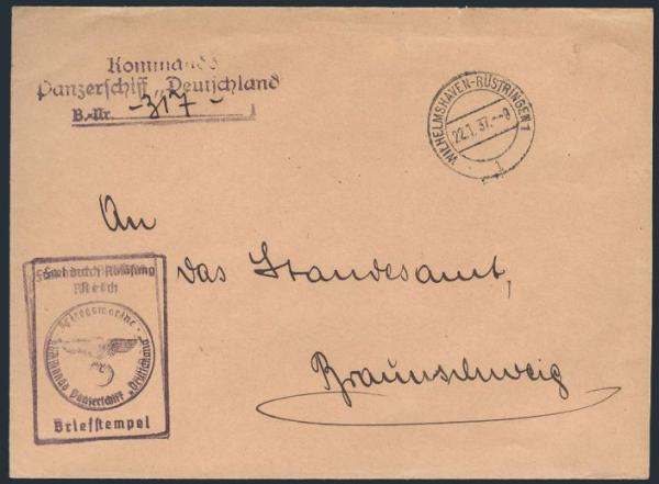 stampless cover from the Command of the naval warship "DEUTSCHLAND" postmarked from Wilhelmshaven 22 Jan 1937. It is addr to the Registry Office in Braunschweig and has an official auxiliary marking indicating that it is Free by Exemption. The