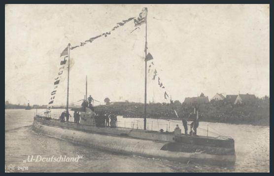 b/w photo postcard of the German U-BOAT "DEUTSCHLAND". This U-Boat was a blockade-breaking merchant submarine originally operating by the North German Lloyd Line & then taken over by the German Imperial Navy. F, some soiling (Image)