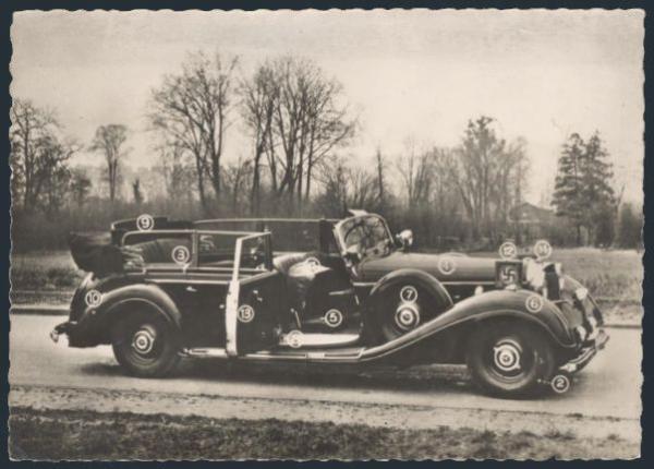 b/w souvenir card depicting ADOLF HITLER'S PERSONAL PARADE CAR. Gives details of armoured plating, bullet-proof windows, engine, etc. Has descriptions in 4 diff languages on reverse. An unusual item! F (Image)
