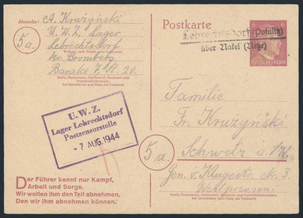 2461   imageScarce WWII LEBRECHTSDORF CONCENTRATION CAMP 6pf Hitler Head postal card. Has boxed 4-lined "U.W.Z. LAGER LEBRECHTSDORF 7 Aug 1944" violet h/s and 2-line Camp cancel. Regular German postal cards were used in this forced labour camp which was located near Danzig. Very scarce. VF (Image) Estimate 400.00+ $Cdn