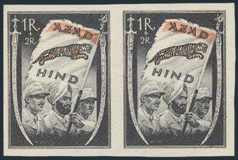 2457   imageAZAD HIND horiz IMPERFORATE PAIR in black & orange from 1943, depicting Indians with Flag. Large margins, fresh colours. VF, NH, trivial natural gum wrinkle. Has guarantee b/s's. VERY SCARCE (Mi #V11bB, Cat 500 Euro) (Image) Estimate 450.00+ $Cdn