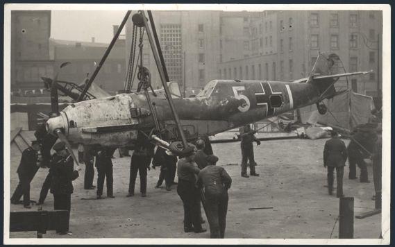 2458   imageUnused b/w WWII real photo postcard depicting British Officers and workers recovering a shot down GERMAN ME 109 FIGHTER PLANE. VF (Image) Estimate 50.00+ $Cdn