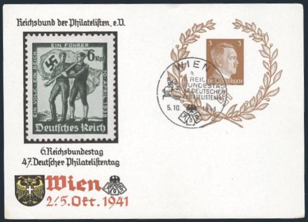 2452   imageUnused WWII Philatelic Exhibition 3ph Hitler Head special order postal stationery card from Vienna with matching 5 Oct 1941 cancel & cachet. VF (Image) Estimate 50.00+ $Cdn