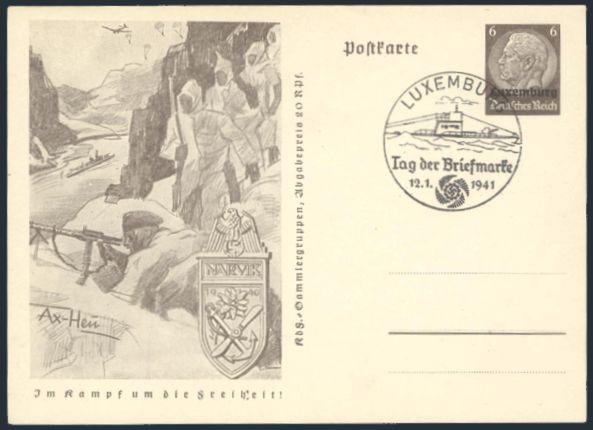 2451   imageTwo diff Hindenburg 6pf Postal Stationery cards overprinted for the occupation of Luxembourg, each with Stamp Day 12 Jan, 1941 cancels depicting German U-Boats. One card has Alpine Troops at Narvik 1941, the other Luftwaffe radio operators. VF (2) (Image) Estimate 60.00+ $Cdn