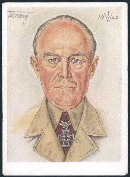 2455   imageUnused Willrich WWII colour illustrated Propaganda postcard from 1942. Depicts Field Marshall / General KESSELRING wearing the Knight's Cross. Has Kesselring's printed signature. F, minor creases (Image) Estimate 50.00+ $Cdn