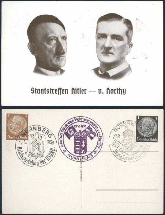 2517 415-6 image415-6, Each tied by a diff State Visit of President V. Horthy of Hungary to Germany 27 Aug - 5 Sept 1938 cancels. Has matching h/s. The postcard depicts b/w photo cameos of Hitler & Horthy. Interesting Third Reich Propaganda item. VF, unaddr (Image) Estimate 75.00+ $Cdn